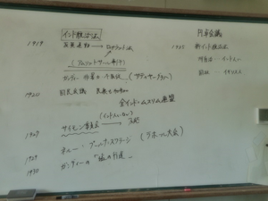 講座によっては生徒たちが勝手に机をグループ隊形に並べ替え(別に私がグループを指示したわけではないのだが)、話し合いを始める。クラスによっては席を立ち歩いて思い思いに議論を開始している。この学習形態が成熟するにつれて、だんだん話し合いが活発になり、騒がしくなるようになってきている。なお、生徒には教科書・資料集・用語集・電子辞書、なんでも使ってよいし、立ち歩いて話をしても聞きに行ってもいいから、講座全員が理解できるようにということをくりかえし指示している。
