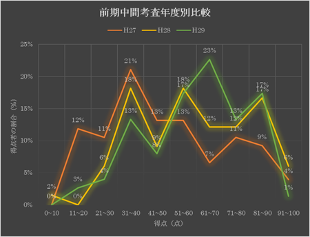 教員1名で40名を教えるより、複数の「教師役」が教室内に現れることで授業効果が高まるのではないかと考えていたが、ここ3ヶ年の前期中間考査の得点分布を比較してみるとそのことが裏付けられた。ここ3年間の3年次生はすべて私が担当しており、授業の範囲や平均点もおおよそ同程度である。ここで問題になるのは得点そのものより、得点分布なのだが、27年、28年の分布に比べて29年度は成績上位者の山が大きく、下位の生徒が少ないことが読み取れる。
