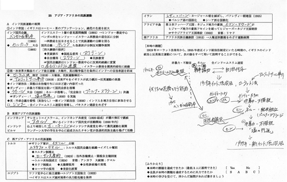 一方、生徒の中から深い気づきにいたる発言が飛び出すことがある。第一次世界大戦時の総力戦について説明させる課題に対し、「新兵器が次々と投入されるようになって、今までの戦争のように戦う兵隊の力量以上に、そういう兵器を発明して生産できるような体制がより重要になったということですか」などという発言をしてくる場合である。教科書や用語集など決まりきったデータであっても、その読み方や消化のしかたは生徒しだいである。時に全く見当違いな受け取り方をする生徒がいないではないが、その場合はユニークな着眼点を褒めると同時にその受け止め方の根拠(教科書や用語集など)に戻ってもう一度解釈を一緒に行うようにしている。