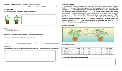 授業外では、英語を話す機会も少なく、さらに自分の発話を見る機会はなおさらありません。そこで、授業では上記のストーリー・リテリングの際に自分のリテリングをパートナーにスマートフォンで撮影してもらい、その動画を見て、声の大きさ、流暢さ、十分な情報が入っているか、相手を意識しているか、などの観点から振り返らせ、また気づいたことをワークシートに記述させて、次につなげる工夫をしています。