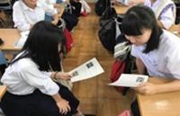 本授業では、生徒自身に、「英語を読みたい」という気持ちにさせることを大切にしています。その際に、キーワードとなるのが「3方向の対話」です。1つ目はオーラル・イントロダクションで聞いた読み取りのポイント(How do plants communicate with insects? What do you think?など)について自らの意見を英語で作ります(自己との対話)。次に、そのポイントについてペアで英語でのディスカッションを行います(他者との対話)。これらの2つの対話を経ることで、生徒は本文内容について自らの思考を深化させ、教材と生徒が結びつき、本文内容への興味・関心が高まります。その後、興味・関心が高まった状態で、読み取りのポイントを探すという目的を持ったリーディング活動に入ります(教材との対話)。