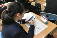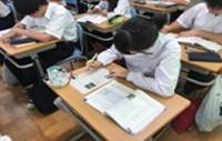 本授業では生徒の英語の4技能(聞く・読む・話す・書く)の向上を目的として、自らが読んだり、聞いたりしたことや経験したことについて、英語で話したり・書いたりするアウトプット活動に力点を置いています。また教科書で学んだ内容、語彙、文法をアウトプットできるレベルまで引き上げるために、教科書の本文内容についての絵や写真だけを見て要約を口頭で伝える活動(ストーリー・リテリング)を毎回の授業で行います。毎回の授業で、英語を用いたやり取り(対話)の場面を増やし、生徒の英語運用能力を養います。また、学年目標として、1年次の間に英検準2級取得を掲げています。
