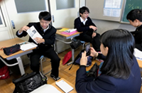 本授業では冒頭の1分間チャットやストーリー・リテリング、教科書本文に関する英語でのディスカッション、ペアで一緒に考えながら( )抜きの内容語を補う音読活動など、他者とのやりとりの機会を多く与えることで、生徒の思考力・判断力・表現力を高めることを大切にしています。