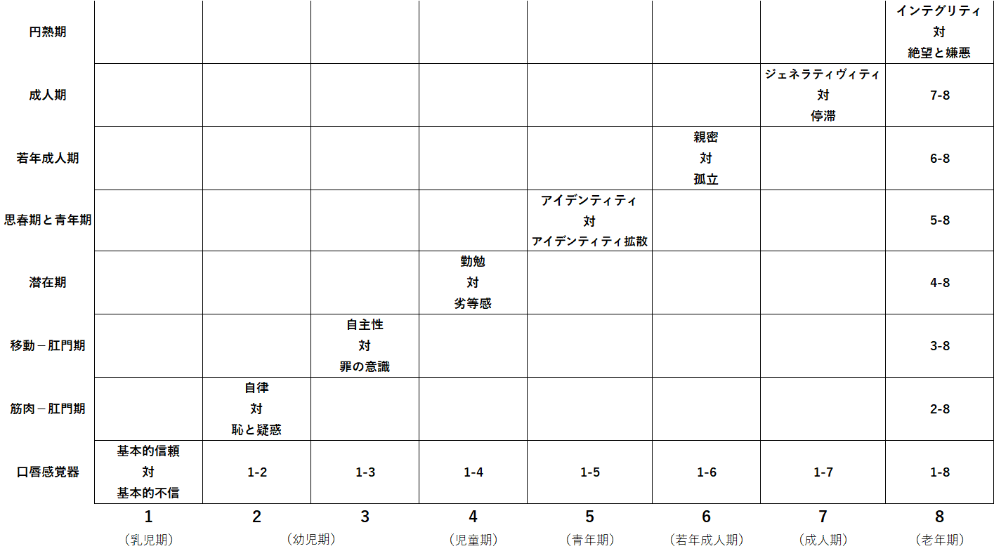 この図式の秀逸なのは、各発達段階で特徴的な危機(たとえば、自律 対 恥と疑惑)を対角線上に置き、残りをマス目にして、ある発達段階に特徴的な危機がライフサイクルのなかで繰り返し解決されるものであることを表している点にある。このマス目によって、ある発達段階の危機を克服することが、後続の発達段階の良好な発達を必ずしも保障しないことを表すことになる。