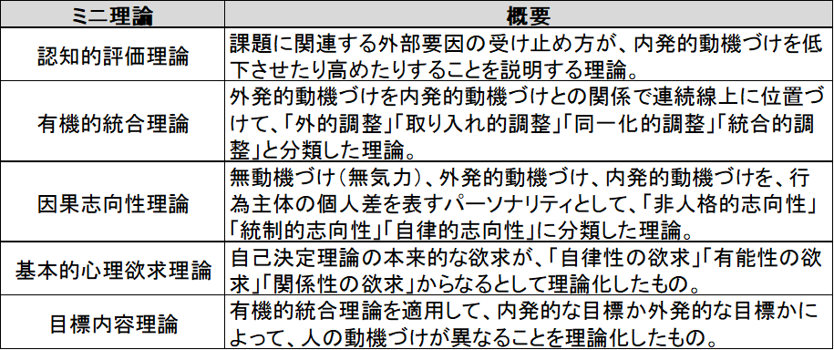 内発的動機づけの考えは、行動に対する自己決定性の高さが学業成績やパフォーマンス、精神的健康等に影響を及ぼすという「自己決定理論(SDT:self-determination theory)」として発展しており(Deci & Ryan, 1985, 2011; Ryan & Deci, 2000)、今日自己決定理論を説明する「認知的評価理論」「有機的統合理論」「因果志向性理論」「基本的心理欲求理論」「目標内容理論」といった五つのミニ理論が示されている(図表1を参照)。以下、デシとライアン他(Deci & Ryan, 2012; Reeve, 2012; Ryan & Deci, 2000)の説明をもとに、それぞれを簡単に紹介しよう(日本語文献として、櫻井, 2009, 2012も紹介しておく)。