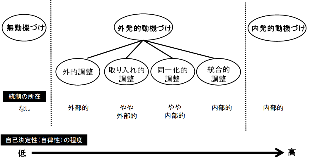 それぞれを簡単に説明すると、「外的調整」は報酬を受け取るためや罰を避けるためなど、外部からの統制(期待や要請等)に従う動機づけであり、もっとも自己決定性(自律性)が低い外発的動機づけだとされる。「取り入れ的調整」は、自尊心を維持させるために、あるいは人前で自尊心が傷つくことを恐れるがゆえに、外部からの統制(期待や要請等)を内部に取り入れて自己内調整をして従う外発的動機づけである。外的調整よりは、自我関与が加わっている分若干自己決定的ではあるが、統制の所在は外的調整と同様外部寄りにある。「同一化的調整」は、外部からの統制(期待や要請等)に価値を認め(“重要だ!”“有用だ!”など)、積極的に自己内に取り込んで、選択的に、個人的に関与して行動する動機づけである。「統合的調整」は、外的な統制(期待や要請等)に価値を認めるだけでなく、それを自己の他の側面と有機的に統合して行動する動機づけである。たとえば、「私は将来学者になりたい」といった自己の他の側面と統合して、学習に動機づけられるような場合がそうである。