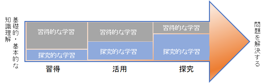 以上2点をまとめると、基本的に、習得・活用は教科内の学習を指し、探究は総合的な学習の時間における学習を指す。しかし、習得・活用・探究の学習は、各教科や総合的な学習の時間を超えてスパイラル的に取り組まれるべきものであり、そうして各教科・総合的な学習の時間の学習を発展させるものである。