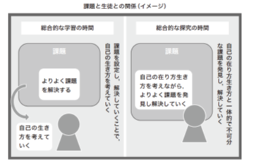 その上で、総合的な探究の時間は総合的な学習の時間よりも、自律的に行われるものと説かれる。単なる問題解決ではなく、自身にとって関わりがある課題を発見し、それが自身の生き方に繋がるような取り組みとなることが期待されている。