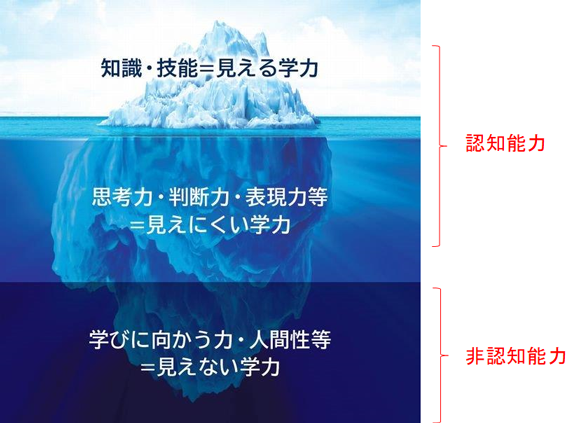 OECDレポートでは、9つの国々の青少年を対象にした研究結果をもとに、非認知能力(社会情緒的スキル)が認知能力の向上に影響を及ぼす効果は認められても、認知能力が非認知能力に影響を及ぼす効果は認められなかったと述べられている。この結果は、学力の三要素をたとえた氷山モデルにおいて、非認知能力(学びに向かう力・人間性等)が海面上と海面下表層にある認知能力(知識・技能、思考力・判断力・表現力等)を海面下深層から支えているという無藤(2016)の考えを支持するものである。
