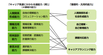 また、中央教育審議会答申「今後の学校におけるキャリア教育・職業教育の在り方について」において、社会的・職業的自立に向けて必要な基盤となる能力として「基礎的・汎用的能力」が示された。 なお、「基礎的・汎用的能力」については下記のように整理されて示されている(図表1)。