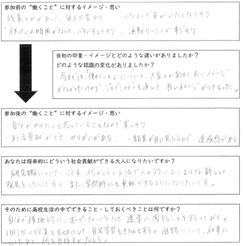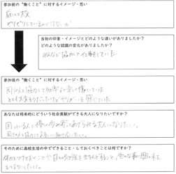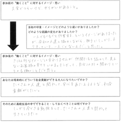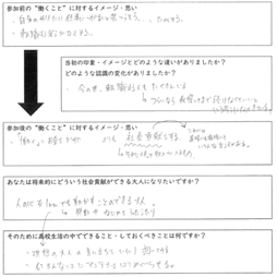 事後指導では「振り返り」を大切にしている。当日の内容を振り返ることはもちろん、事前指導時の自分とどのような点で意識の変化があったかということを言語化することに重点を置いている。 「働くこと」に対するイメージの変化はもちろん、将来のワークキャリアに関する意識変化を自分の言葉で語り、将来像を持てるようになることを一つの目標としている。また、その将来像の実現に向け、 これから何をすべきかを言語化することで「二つのライフ」を意識して今後の高校生活を送れるように意図している。