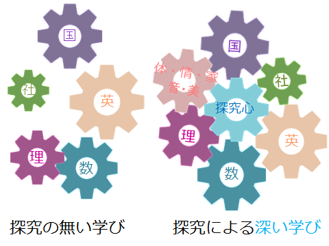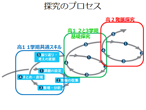 最後に、半年間探究についての取り組みに携わった立場から「課題研究」と探究の違いについて触れたいと思います。文科省が「課題研究」を理科の単位として認定した時(2011)から「課題研究」では、設定する課題が科学や数学などの「自然科学分野」に限定されていましたが、「探究」では、生徒が学びたいと考える「すべての分野」が対象になります。授業時数や対象学年などの違いはありますが、課題の解決を図るために個人やグループで研究を行い、専門的な知識と技能を関連付け、その深化、総合化を図るとともに、問題解決の能力や自発的・創造的な学習態度を育てるという目的は同じです。