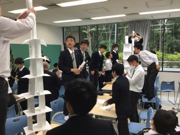 第1回目は『1学期の授業の共通スキル10回分の流れ』について2時間程度で行いました。実際に配布される教材をもとに、授業で取り扱うワークシートを教員どうしがグループを組み、生徒の立場になったつもりで探究の必要性を体験してもらいました。特に、チームビルディングをテーマにした回の授業のワークで取り扱ったペーパータワー(A4紙20枚を使って、できるだけ高いタワーをつくる)では、教員であることを忘れ、仲間と一緒に一つの目的を達成させるためにリードする人や時間を管理する人、アイディアをまとめる人など、みんなで探究している姿が印象的でした。
