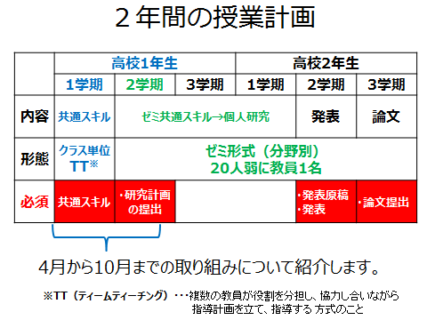 タスクチームとしては、みらとびを担当する81名の教員が出来る限り自由にやりたいことを探究させてあげたいという思いではありますが、それを実現するためにも最低限の共通のルールを設けることにしました。なぜなら、探究は教科であり、調査書に文章によって評価がつくからです。生徒にとって深い学びになってもらいたいという目標を達成するために、高1では研究計画書の提出、高2では発表、論文、振り返りを必須とし、それ以外のことはゼミ担当者に一任することにしました。