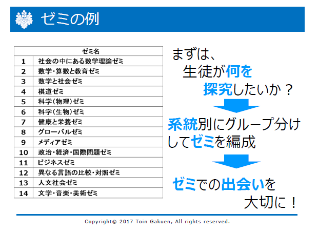 ゼミ担当者の分野が重複しないために、教員から事前に担当することができる分野についてアンケートを実施しました。基本は、『担当者が生徒と共に探究したい分野であり、実際に探究するのは生徒であること。』と『授業を成立させるために生徒が20人程度集まる内容であること』を条件に依頼しました。実際に回答されたゼミの名称と内容をタスクチームで協議し、20人程度集まらないゼミに関しては学習する領域を広げてもらいました。例えば私の場合は、化学ゼミ➡理科ゼミ➡科学総合ゼミというような形で、担当者に負担感が無く、生徒には選びやすい名称と内容の工夫をしました。
