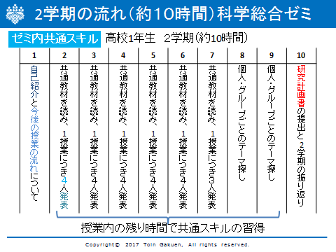 2学期からはゼミに分かれ、担当者ごとにみらとびを実施しています。下のスライドは、私が担当する科学総合ゼミの2学期の計画と、授業内容の一例です。理系のゼミでよくある調べもの学習を通して、自分や他人が科学の何に興味があるかを知り、科学の様々なテーマに触れることが大切であると考えています。ここでの発表を通じて、共同研究にするか個人研究にするか、または物理・化学・生物・地学のどの分野の実験をするか少しずつ決めることが目的です。