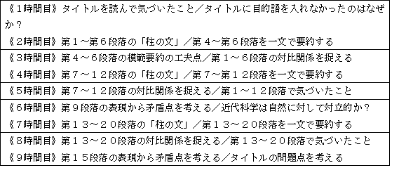 ここで、活用Ⅱの課題をとり入れた私自身の授業実践を紹介したい。高校1年生の国語総合(現代文分野)の授業で、教材は内山節の評論文「自然と人間の関係をとおして考える」である。ここで紹介するのは、段落内容を把握して要約する、対比関係を把握して筆者の主張を読み取る、といった評論文読解の基本的な学習を終えた後の単元中盤(6時間目)の授業である。