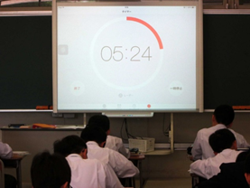 授業の流れを細分化すると、たくさんの場面から構成されていることがわかります。そのひとつひとつの切りかえをスムーズにすることで、かなりの時間が生み出されます。そのための方法の一つとして、タイマー等を用いた時間管理があります。桐蔭学園では、多くの場合、ペアワークやグループワークの時間を指定し、プロジェクターにタイマーを表示しています。教員が自分の説明時間を指定することもあります。