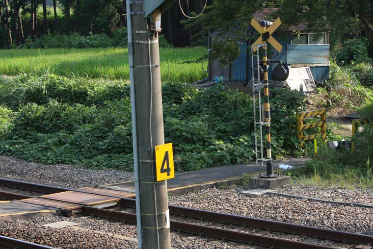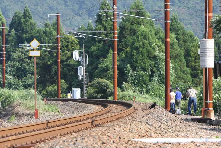 *朝6時半頃、お百姓さんが農作業に出てきた(私の家のそばのお百姓さんに比べると遅いな)。実は踏切も含めて、このあたりはお百姓さんたちの私有地なのだ。私もそうなのだが、鉄ちゃんたちは私有地にずかずか無断で入り込んでいるわけだ。もっとも向こうからすれば、このあたりは何十年も日々鉄ちゃんが来ているわけで、いまさら目くじら立てて怒ったりはしない。私は「おはようございます」と挨拶だけはするようにしている。彼らの歩いている後ろ姿を撮ったが、なんだか映画のワンシーンみたいになった。