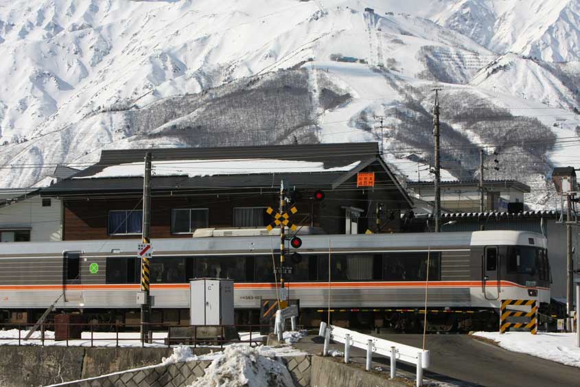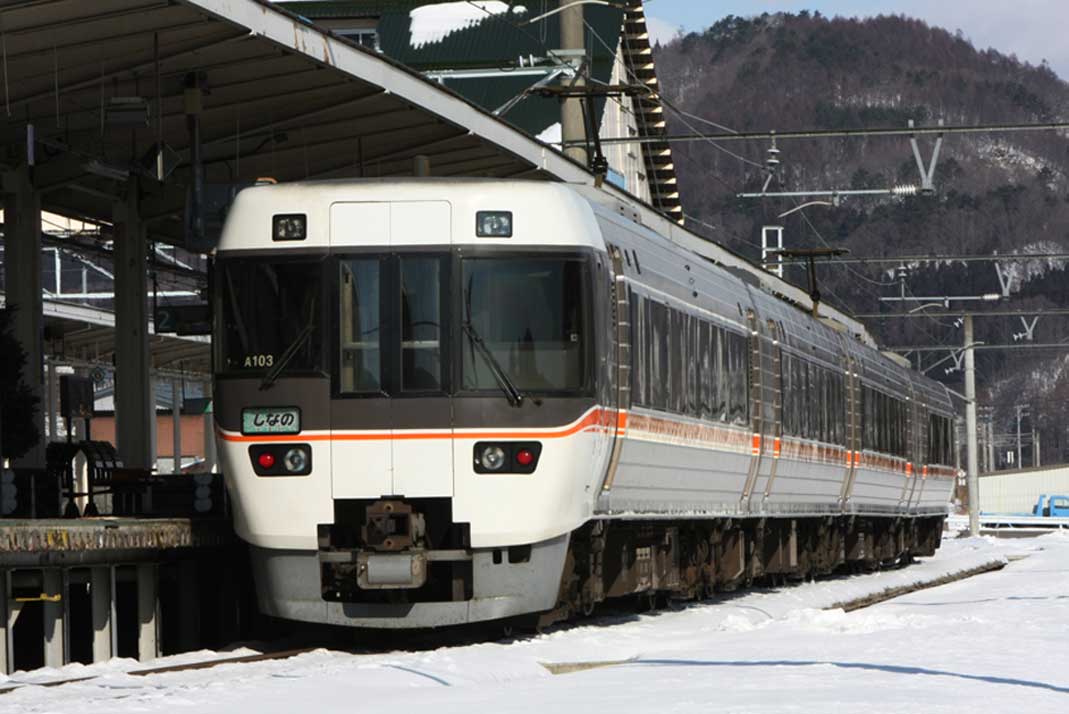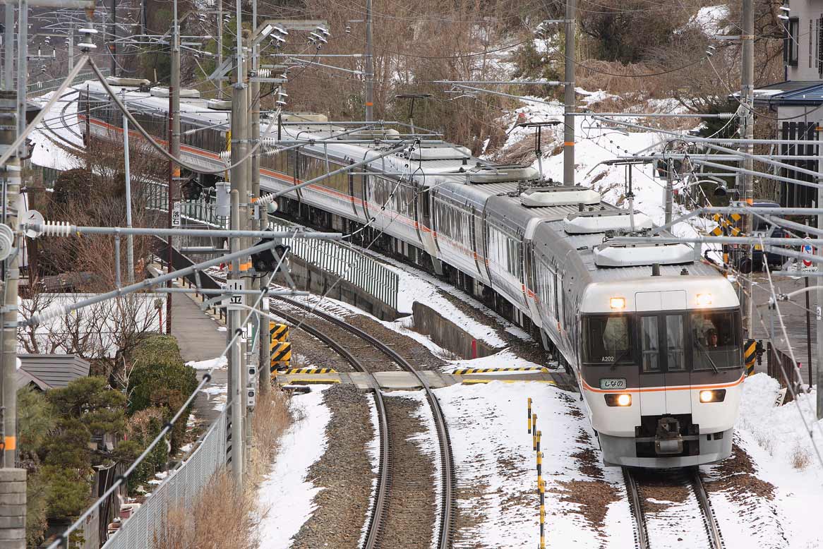 「やっぱり雪ですね」第2弾は、中央本線西側、名古屋-松本-長野間を結ぶ特急「ワイドビューしなの」だ。全体的に雪は少ないが、木曽あたりと年に何回か臨時で入る大糸線とに雪がある。今回はそこを中心に撮影。