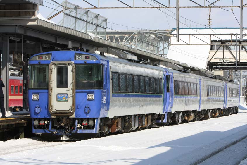 *「スーパー北斗」のキハ281系もそうなのだが(北海道はやはり美しい――函館・室蘭本線「北斗」「スーパー北斗」)、先頭車両が展望デッキになっていて、乗客はそこから列車の走る先を見渡せるようになっている。乗客には最高だろうが、うーん、こういうのは鉄ちゃんとしてはやめてほしいかな。(笑)