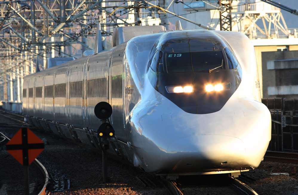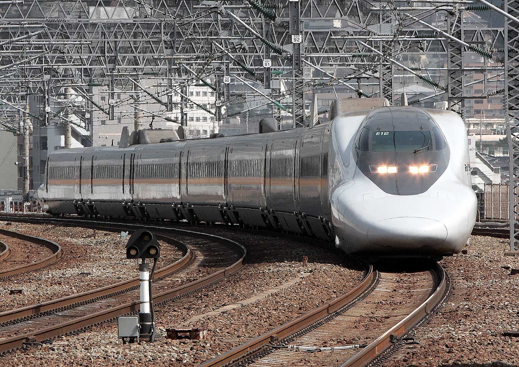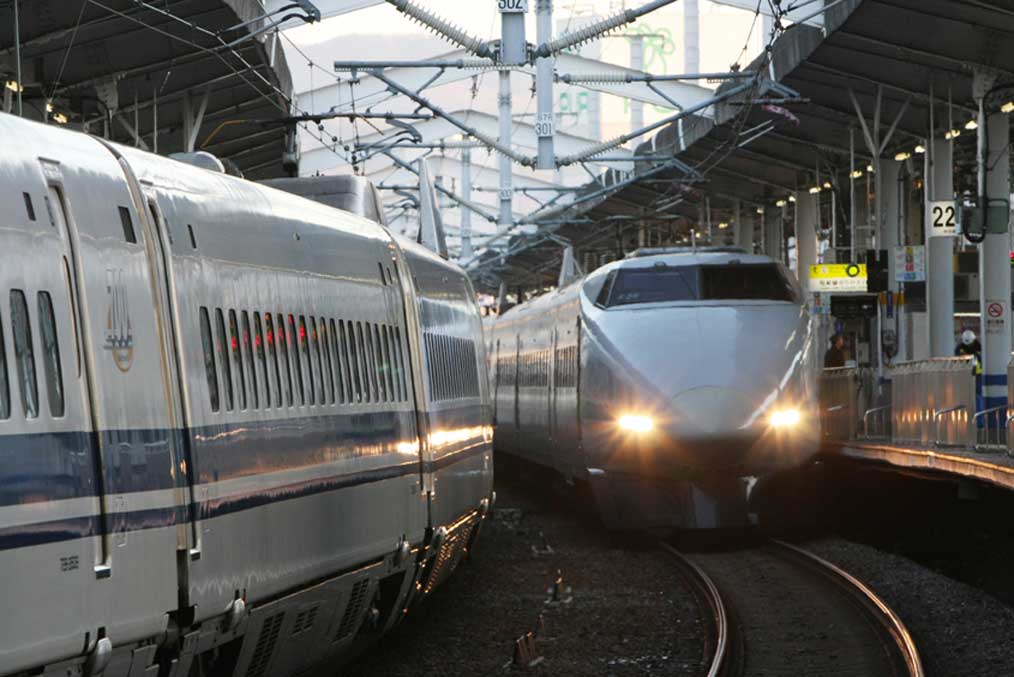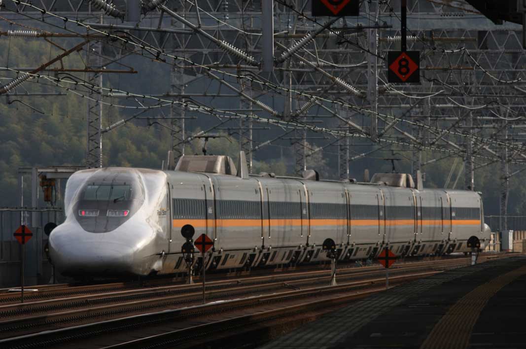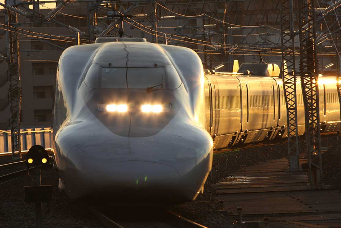 *1999年に登場した東海道新幹線700系をもとにして、2000年に山陽新幹線用(博多-新大阪)として開発。赤々とした夕日を浴びて。