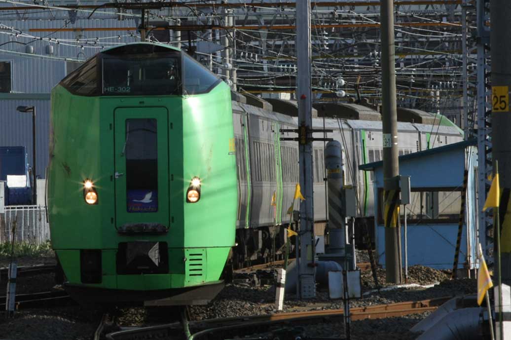 *<写真5>の構図で撮ろうと待っていたら、直前に上り(逆方面)の貨物が入線してきて、「つがる」と入れ替え待ちとなった(単線の奥羽本線ではよくあることだ)。「うわー、編成写真にならない」とおたおたしているところに「つがる」が来てしまった。しかたがないから、これでカシャ。どうせ雨も降ってたし、写真としてはどっちにしてもいまひとつだ。