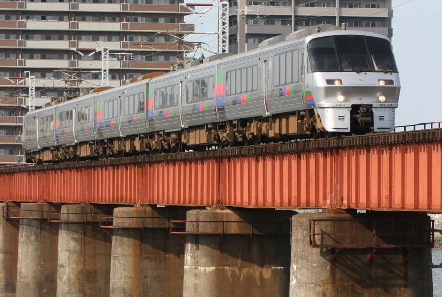*なかなか好きになれませんねぇ、このステンレス新型車両。実は赤色の485系よりもこっちのほうが主力車両なのだけど、あまり撮る気にならず、お見せするのは485系ばかり。(笑)