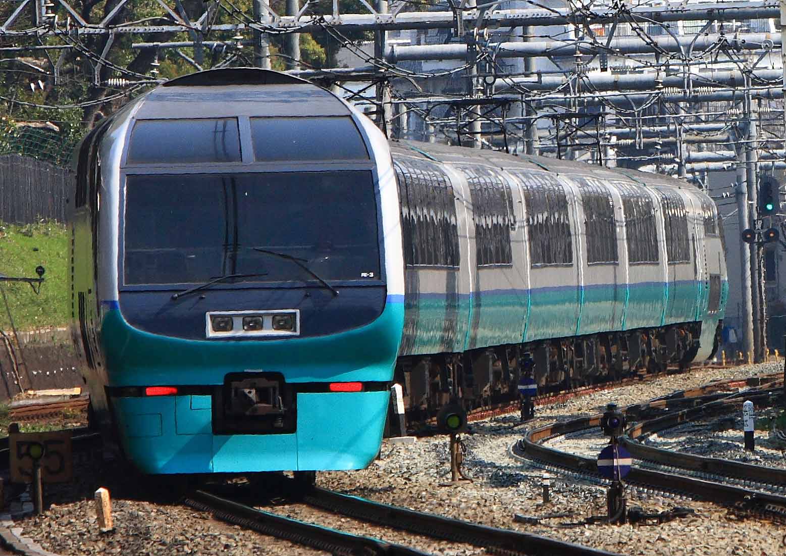*「スーパービュー踊り子」は湘南・伊豆のリゾート列車として展望車両。こうして横から見るとよくわかる。同じ伊豆方面特急だが、特急料金はふつうの「踊り子」よりも高い。