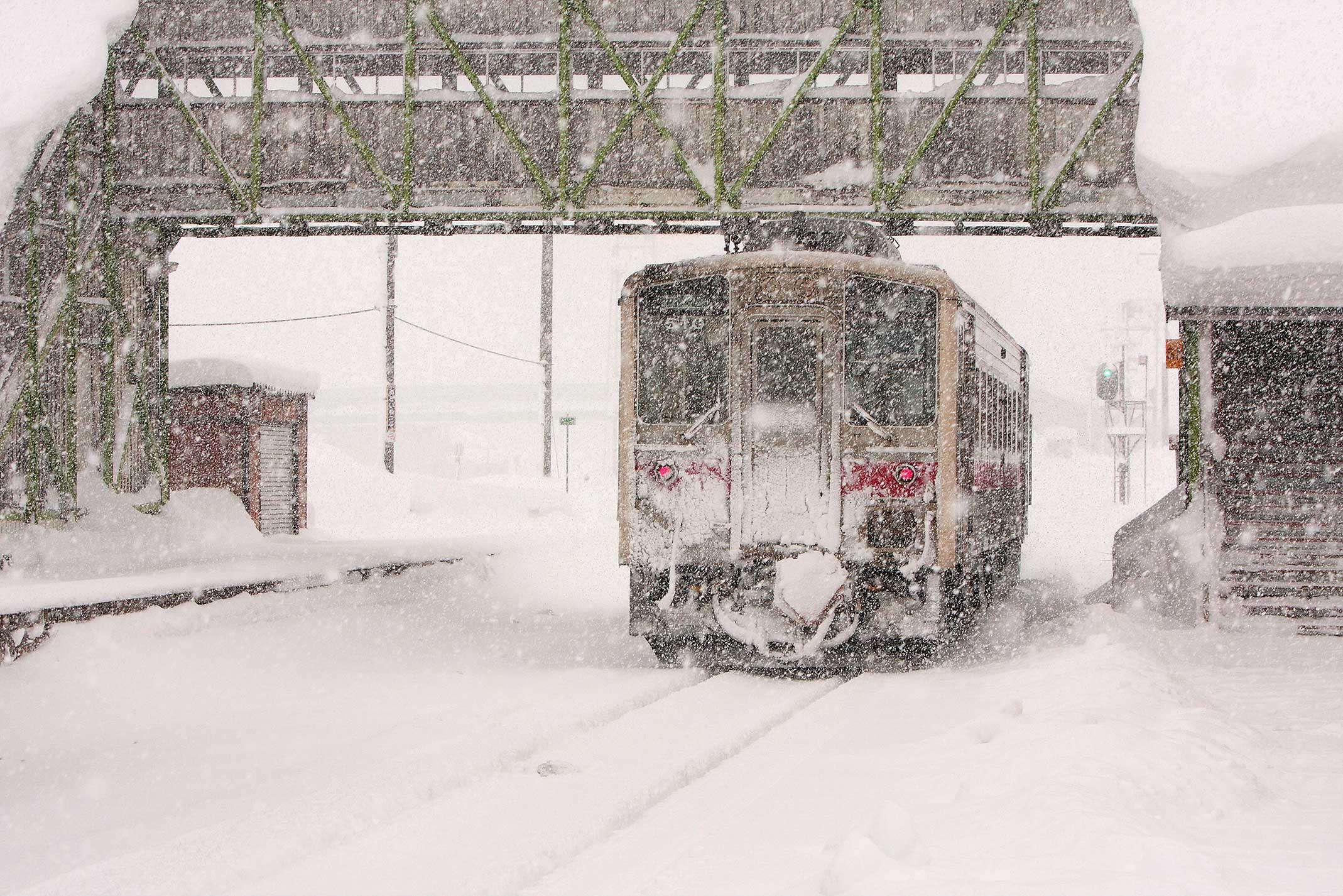 *<写真2>の列車の発車を見守る駅長。雪がぼたぼたで、どこがホームか線路かわかりません。