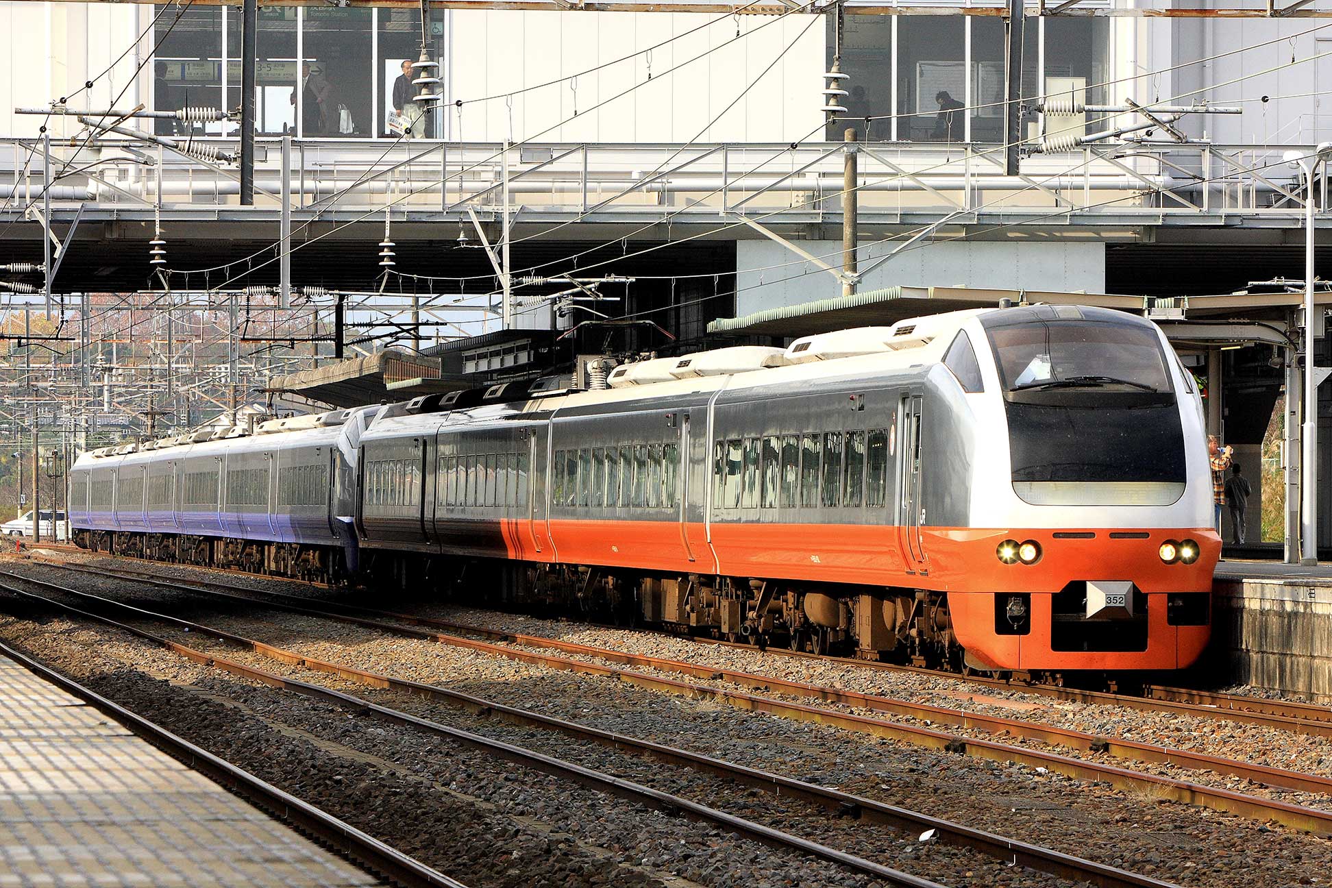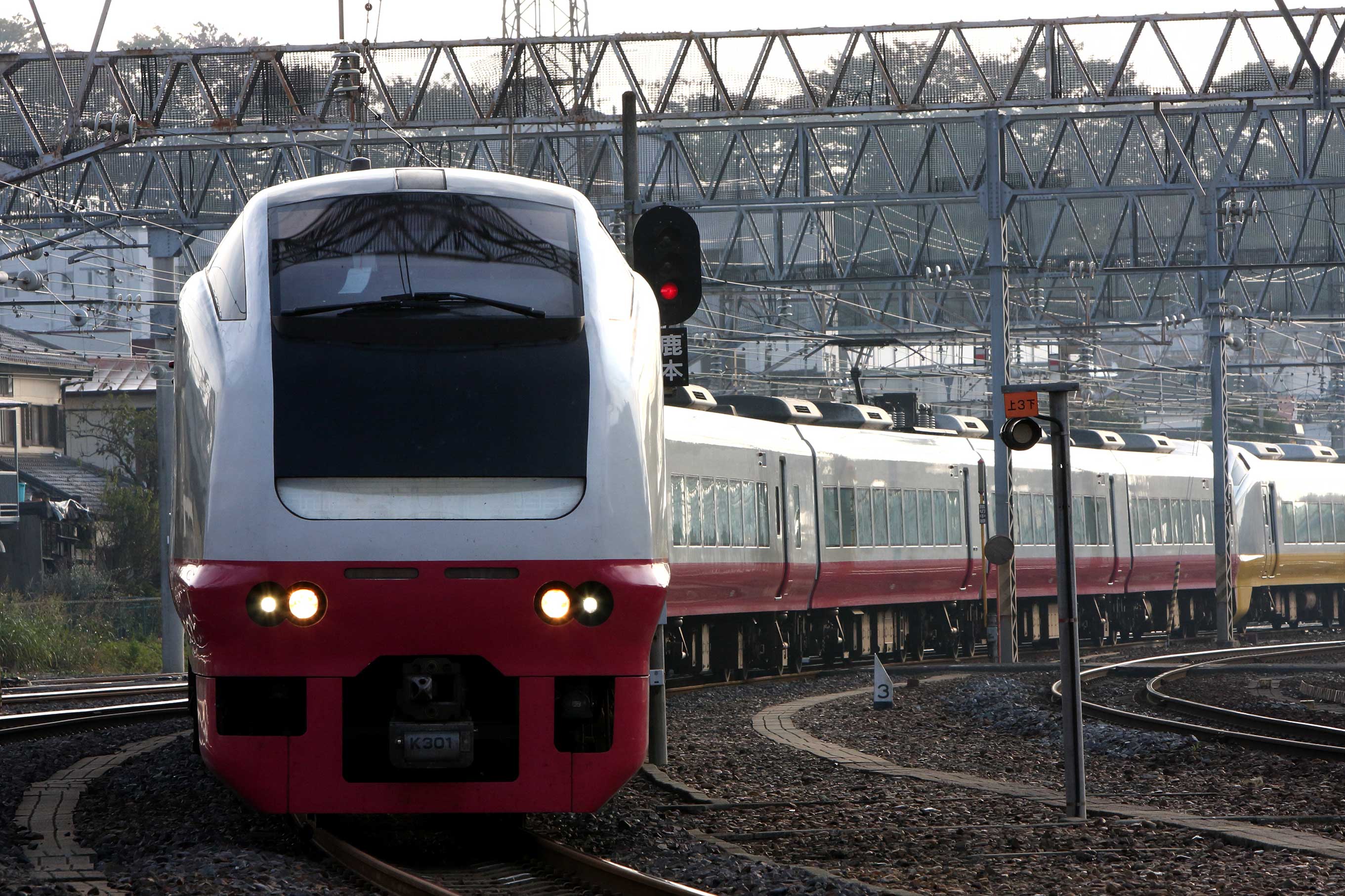 「フレッシュひたち」用のE653系は、青緑・赤・青・黄の4種類がある。写真はそのなかの「赤」の車両。青森圏のE751系特急「つがる」と似ている。
