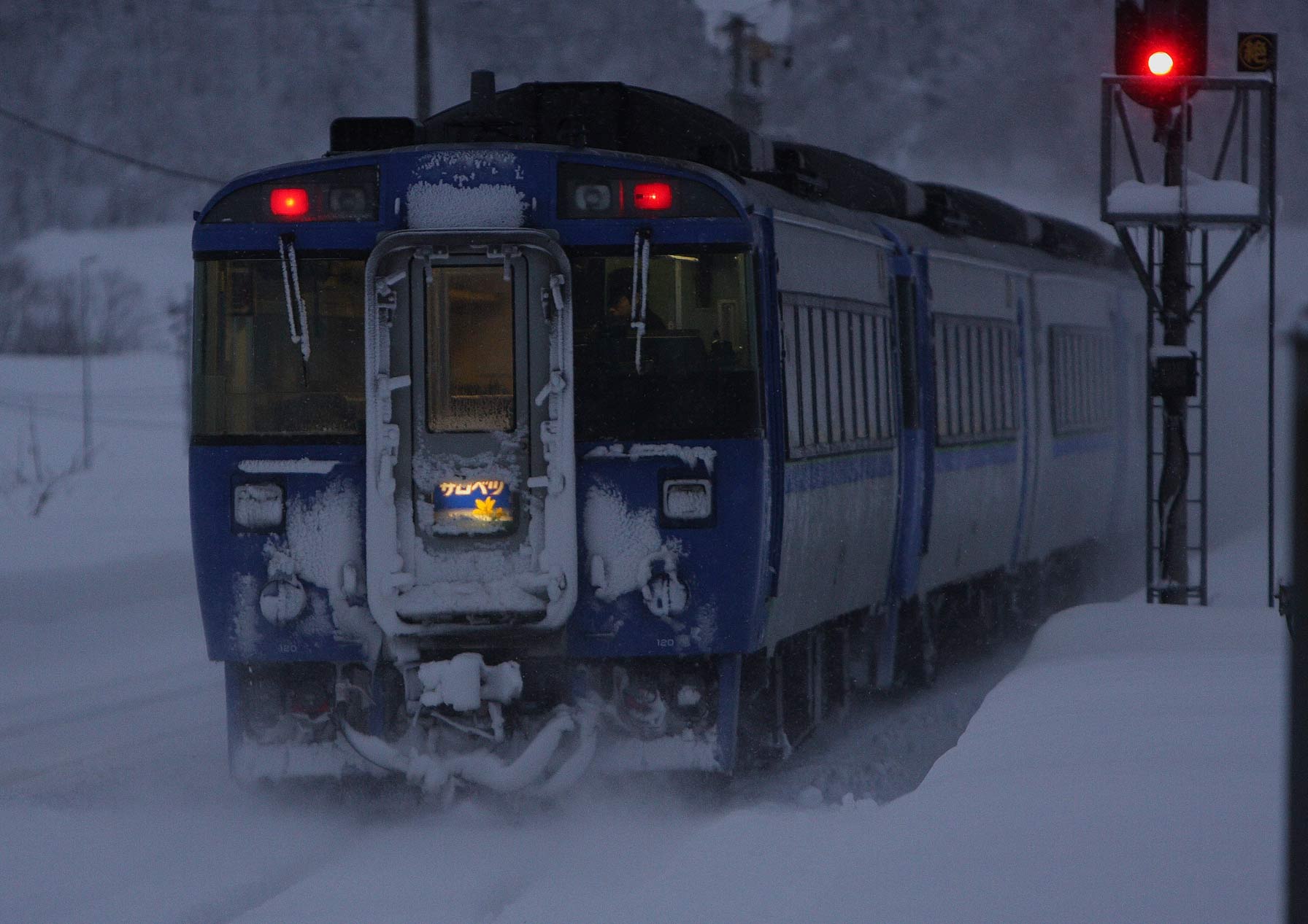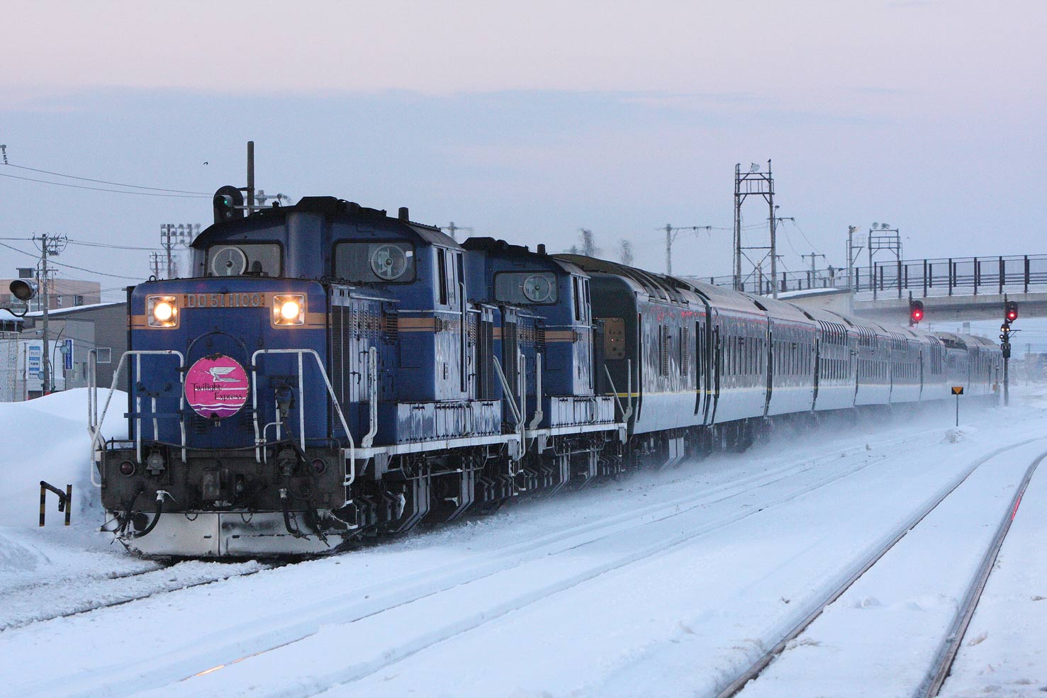 *6:45am頃に長万部駅を通過する「トワイライト」。1月では暗すぎて撮れません。2月はぎりぎり明るくなりますが、雪が残っているかがこの時期はわからない。もう1つ言うと、この4,5年、トワイライトは雪の季節しょっちゅう運休になる。ばくちのような写真です。