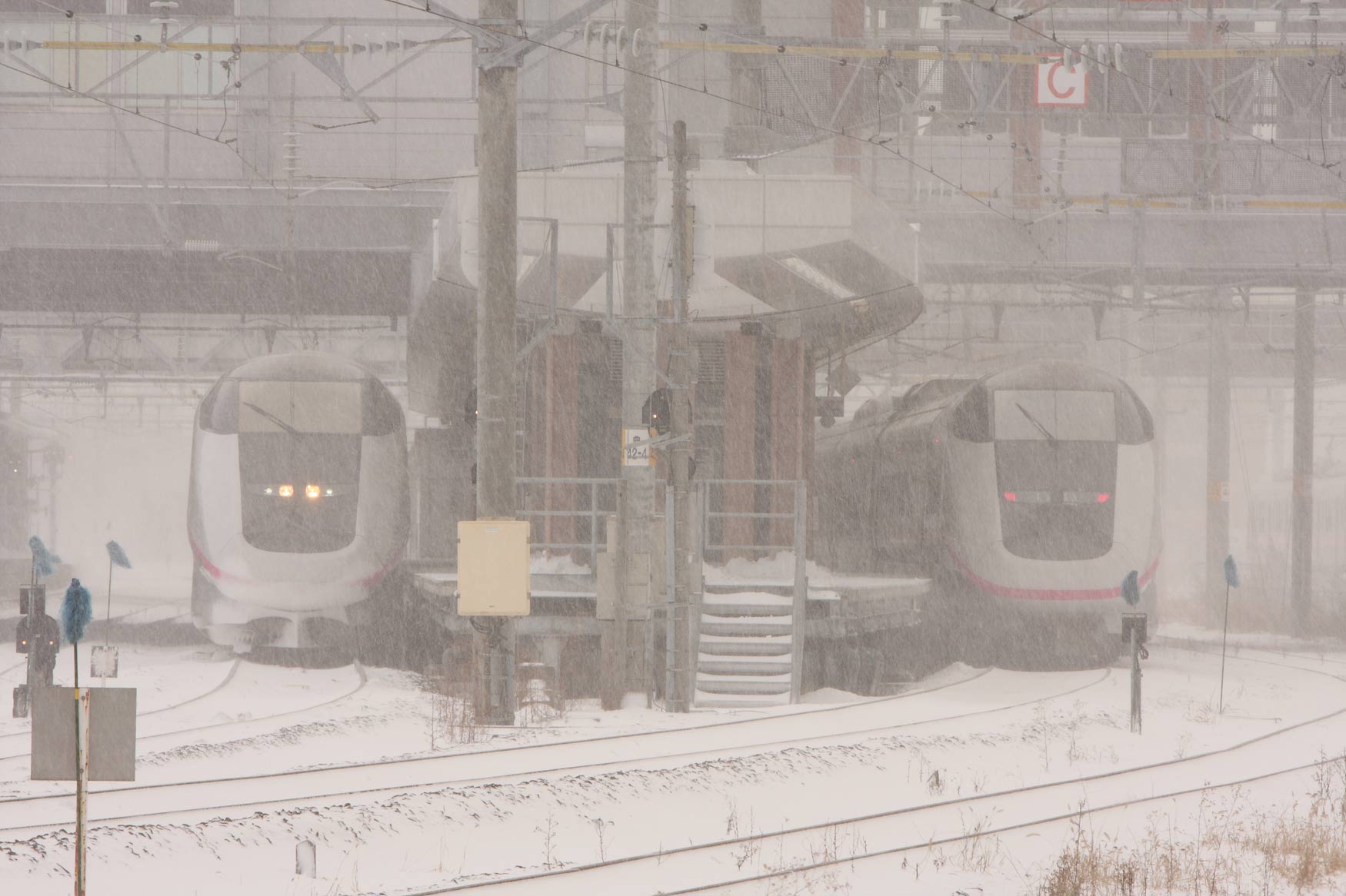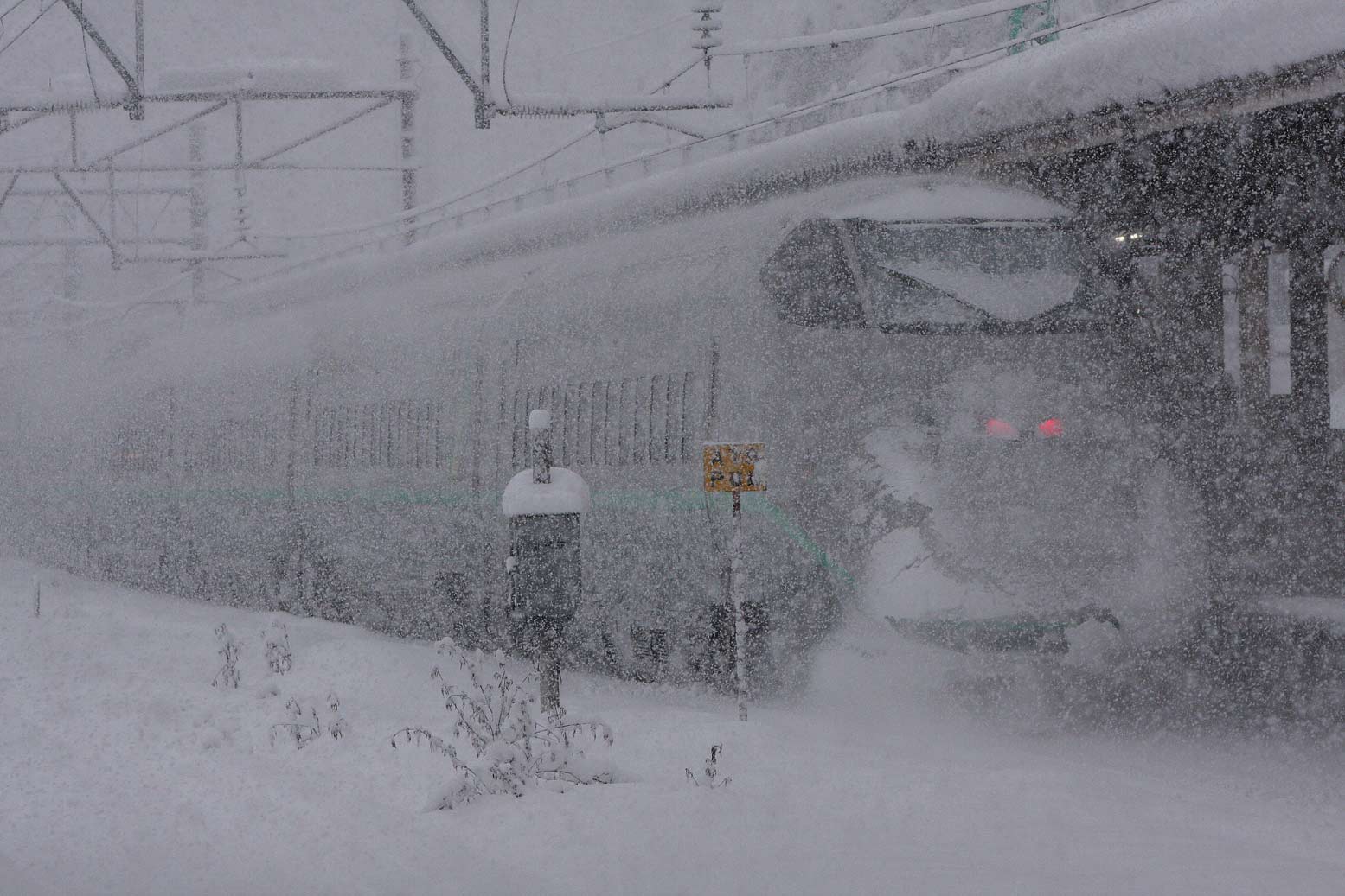 *前日まではまったく雪がなかったが、一夜で積雪の秋田駅。写真の時間帯は吹雪でダイヤが乱れ、発車待ち。