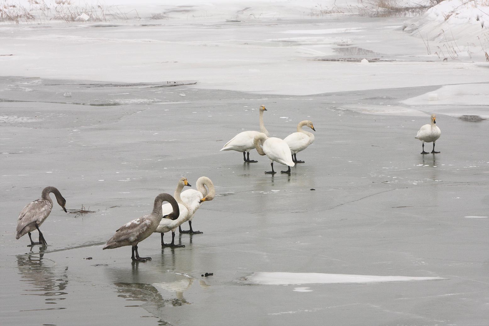 *足まで見えると、まるでアヒルのようになってしまうハクチョウ。これ本当にハクチョウ?と思う方は、手で足を隠して見てください。ああ、やっぱりハクチョウだ!となります。ちなみに、釧路は他の北海道地域と違って、雪はあまり降らないけど、寒いので雪が溶けない。かつ、川、湖がすぐ凍ります。氷の世界ですね。