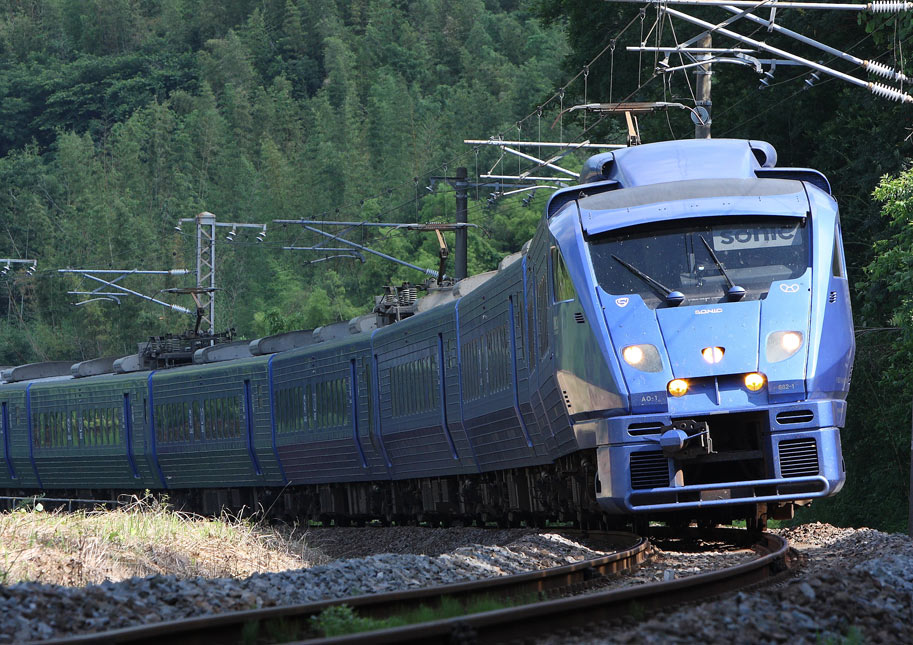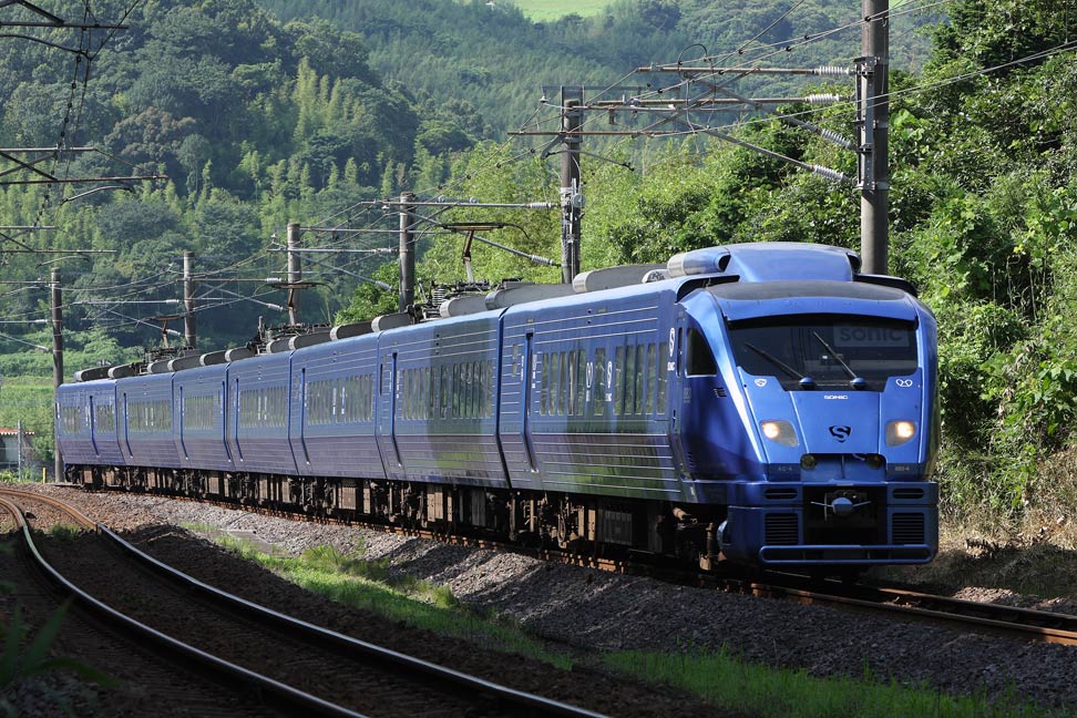 1995年883系(写真1・2)の「にちりん」(博多-大分間)を「ソニックにちりん」としたのが始まり。1997年以降博多-大分間の特急はすべて特急「ソニック」と改称。角張ったいかつい外観で、写真を撮るのが難しい車両の一つ。
