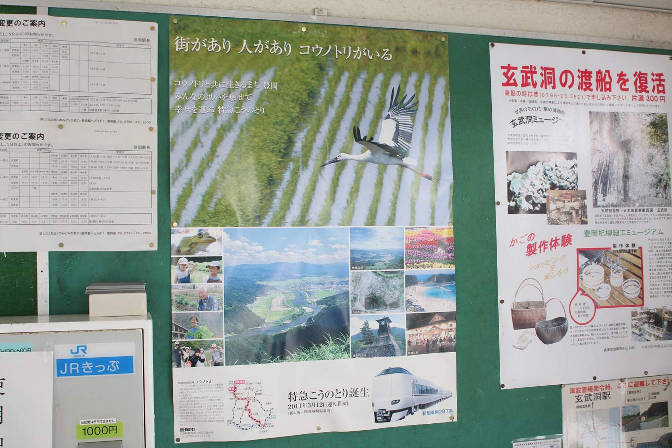 *駅の掲示板に貼ってあるポスター(特急「こうのとり」誕生)。兵庫県豊岡市で繁殖が進められているコウノトリにちなんで、特急「北近畿」を「こうのとり」と改称。地元自治体などからの強い要望を受けて改称が決定した。