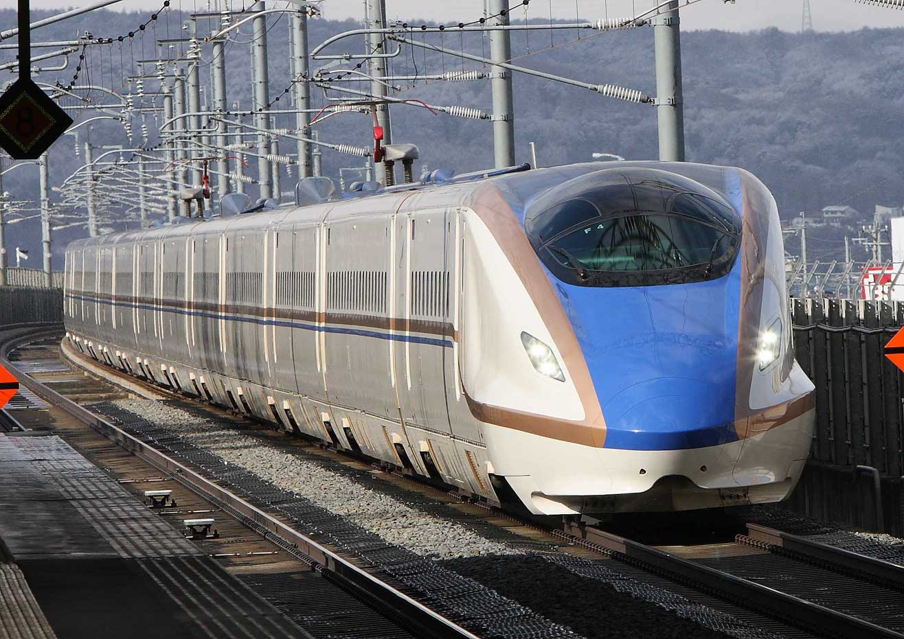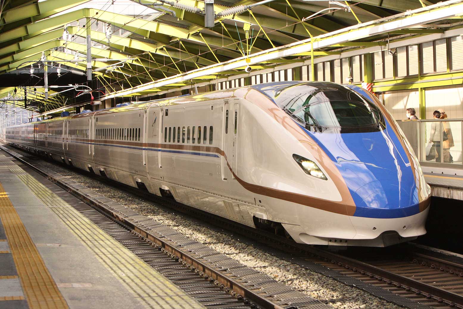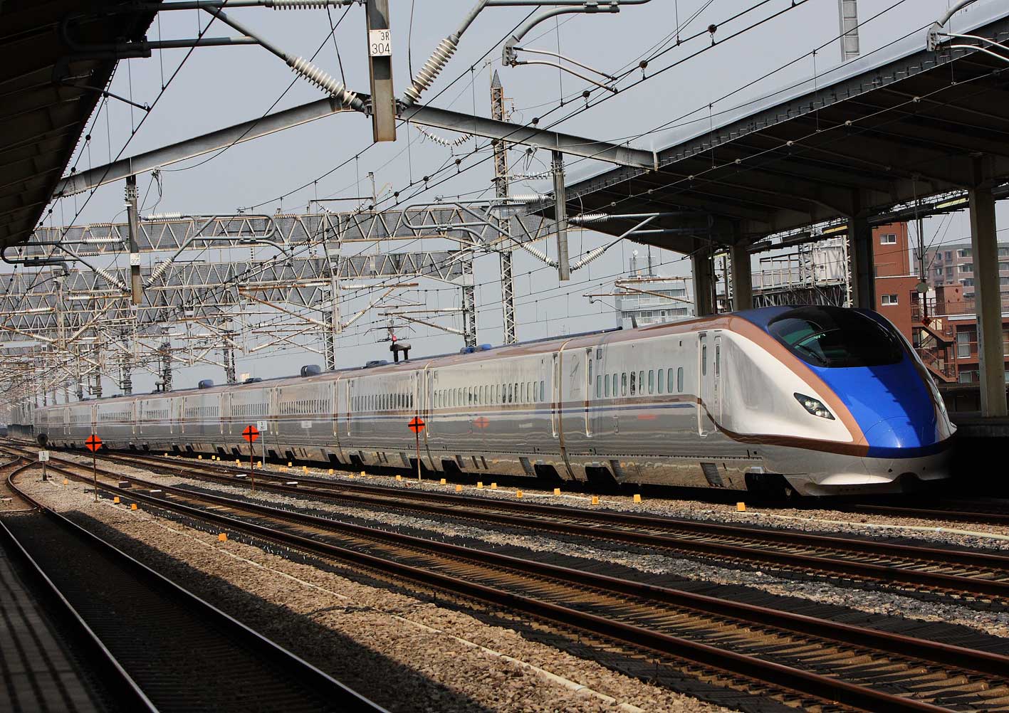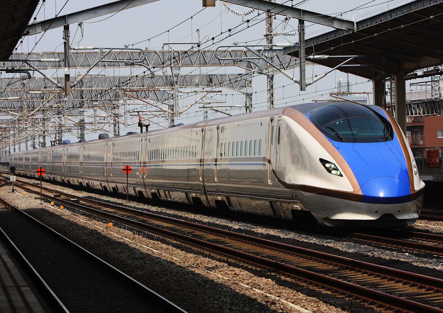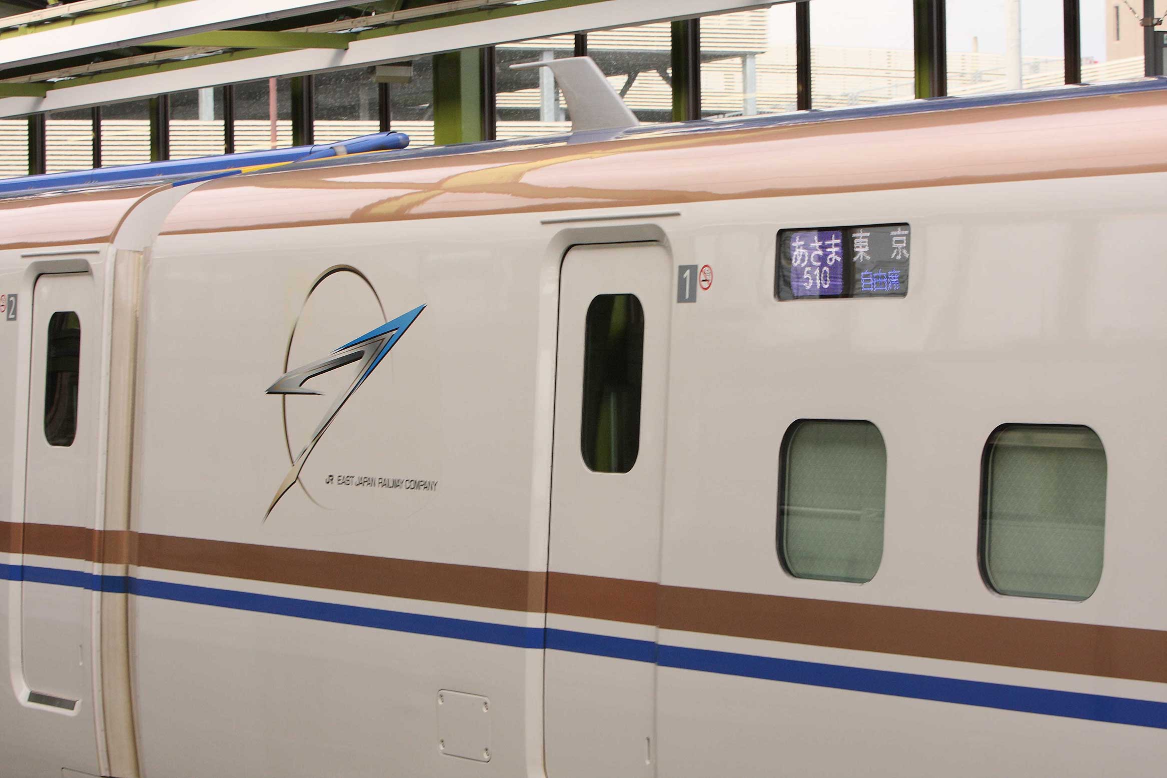*2015年3月14日の北陸新幹線(東京-長野-[延伸]-金沢)開業前に、一足先に「あさま」の輸送を始めた新型のE7系車両。