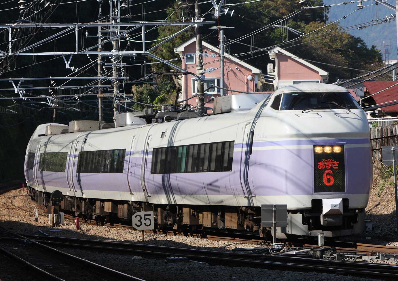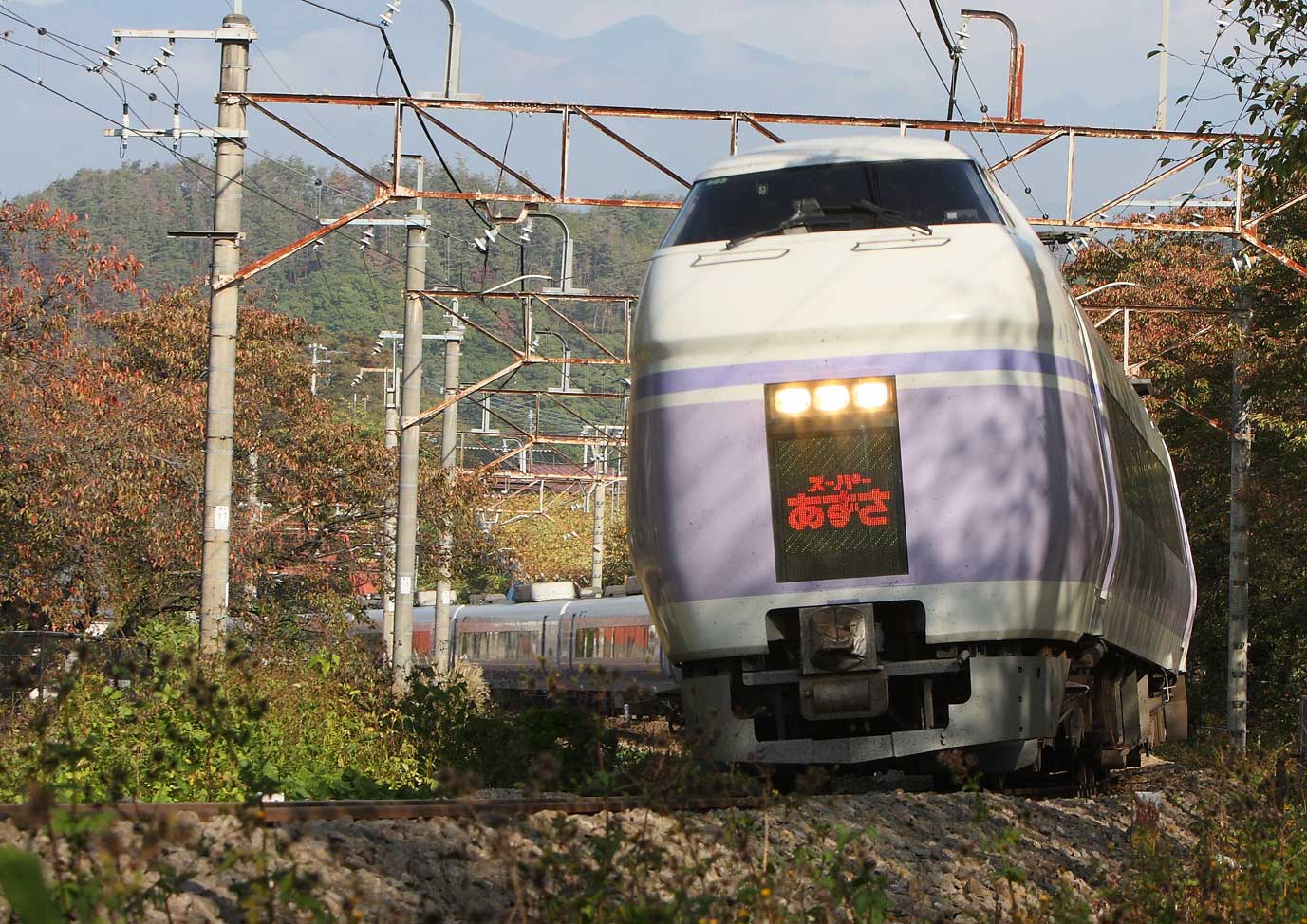 「スーパーあずさ」「あずさ」は東京(新宿)-松本を結ぶ特急列車。「かいじ」は東京(新宿)-甲府(竜王)を結ぶ特急列車。2016年度より新型車両が投入され、E351系(スーパーあずさ)、E257系(あずさ、かいじ)が置き換えられていくことが発表された。20年見てきたこれらの車両もそろそろ終焉。以前は大糸線(南小谷、信濃大町駅)まで入線していた。ちなみにE257系は千葉県房総半島の特急群でも使用されている車両だ(E257系500番台)。