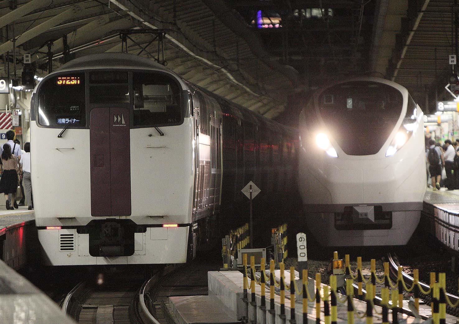 *湘南ライナー4号(左)と2号(右)が7:40に同時に品川に到着する。同時入線というちょっとした名物となっている。2号は東京行きなので、幕がまだ表示されている。