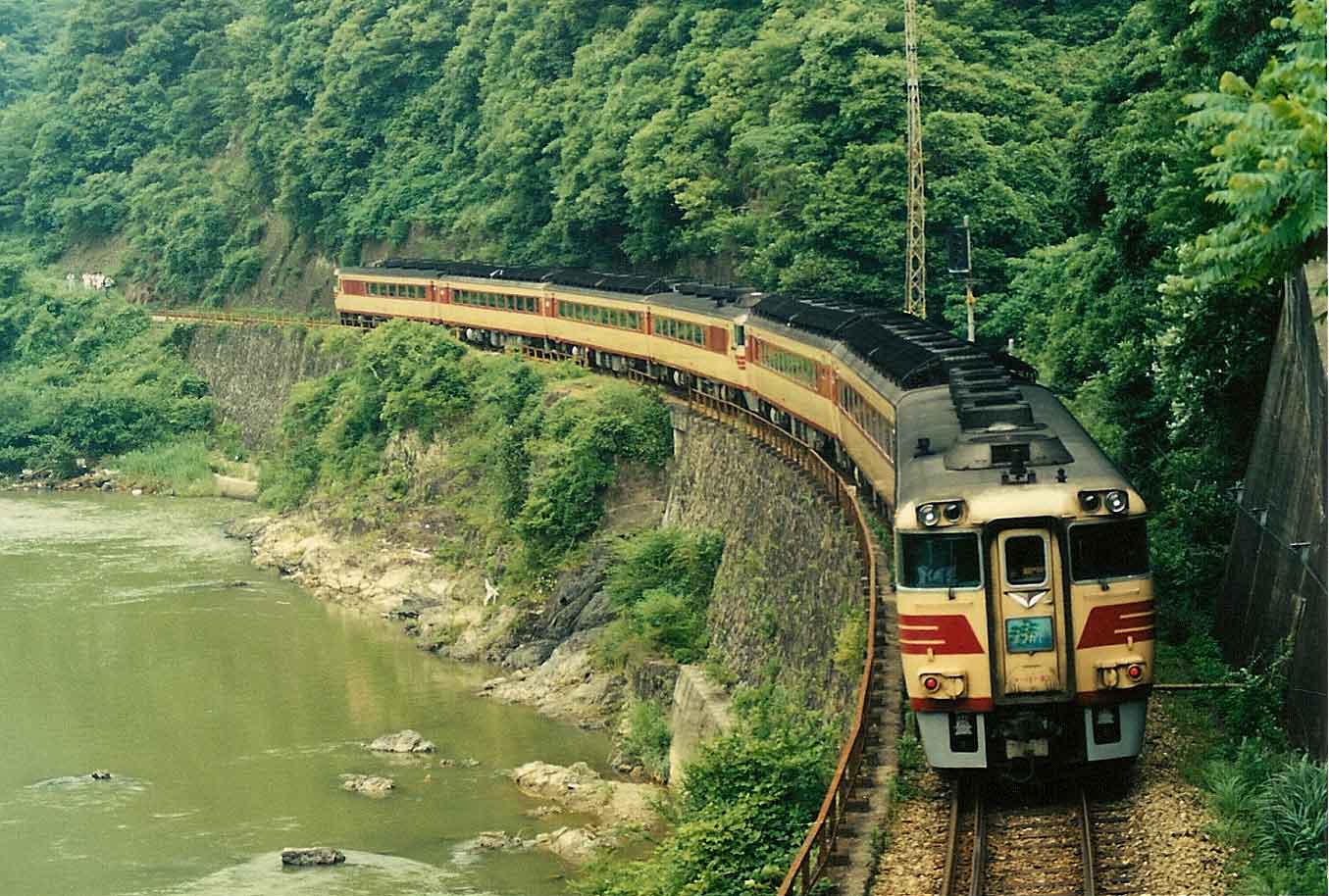 *なつかしいですね。今は遊歩道になっている武田尾渓谷です。キハ181系の特急「まつかぜ」は福知山線電化に伴って1986年11月に廃止。この写真は電化直前のもの。