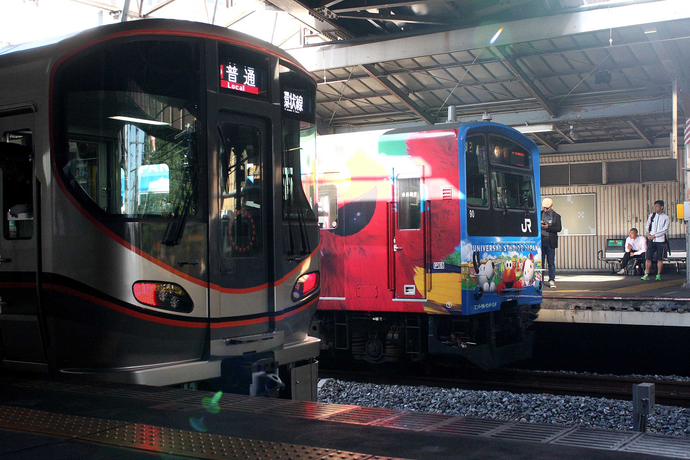 大阪環状線京橋駅 (手前)323系+(奥)201系(ラッピング)普通列車 2018年5月
